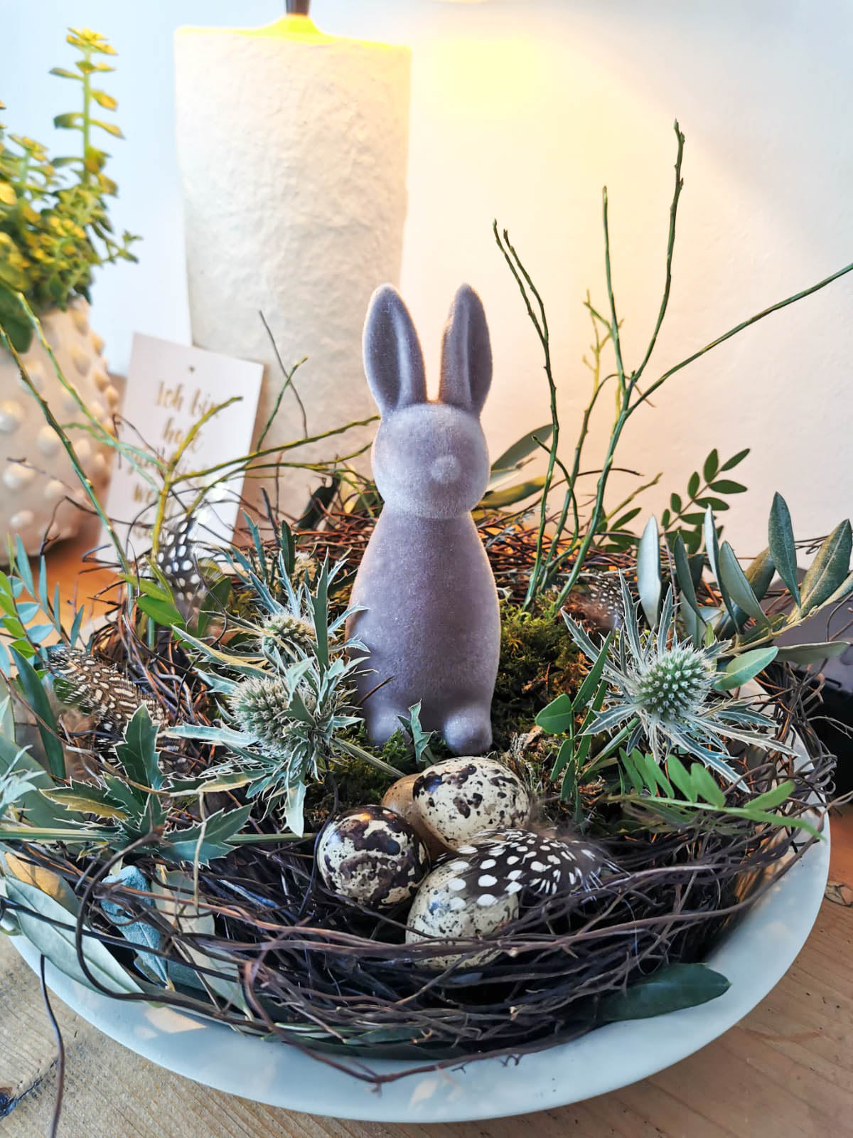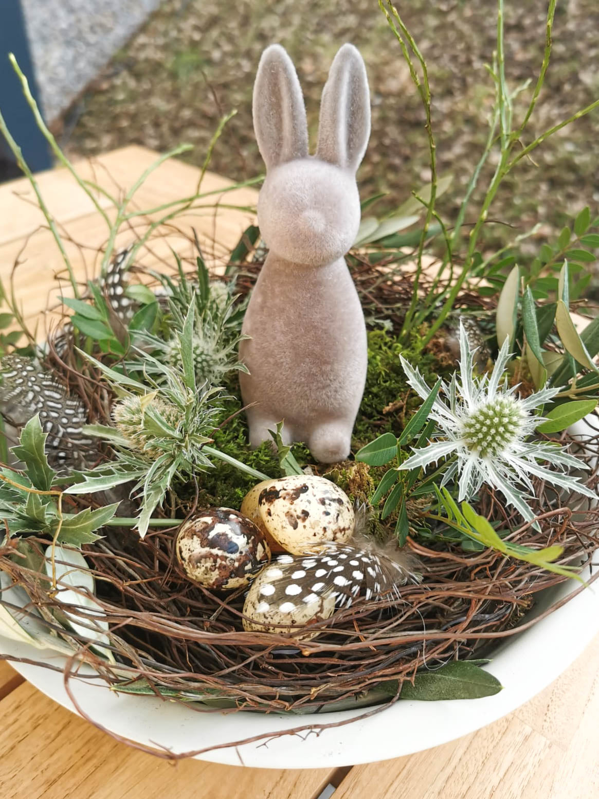 Dekoriert mit frischen Olivenzweigen, Edeldisteln, Eukalyptus, Thymian- und Pistazienzweigen, Federn und Wachteleiern.